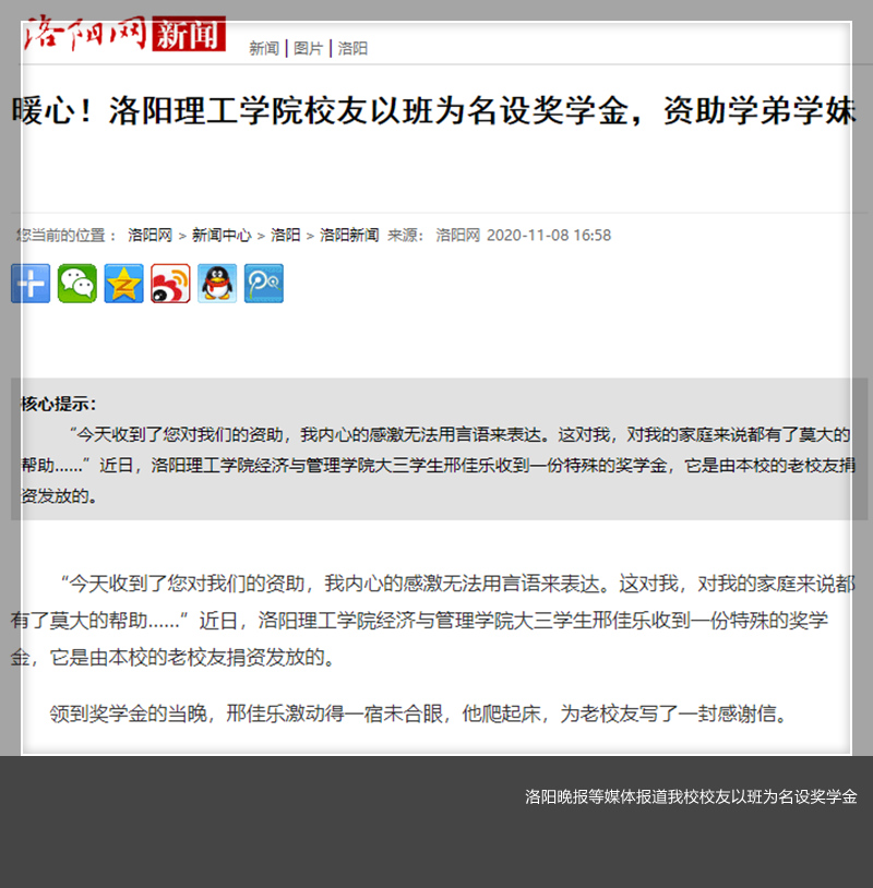 11月8日,洛阳晚报、洛阳网等媒体以《暖心!美高梅娱乐场 校友以班为名设奖学金,资助学弟学妹》为题报道美高梅娱乐场 经济与管理美高梅娱乐场 校友设置奖学金的事宜。