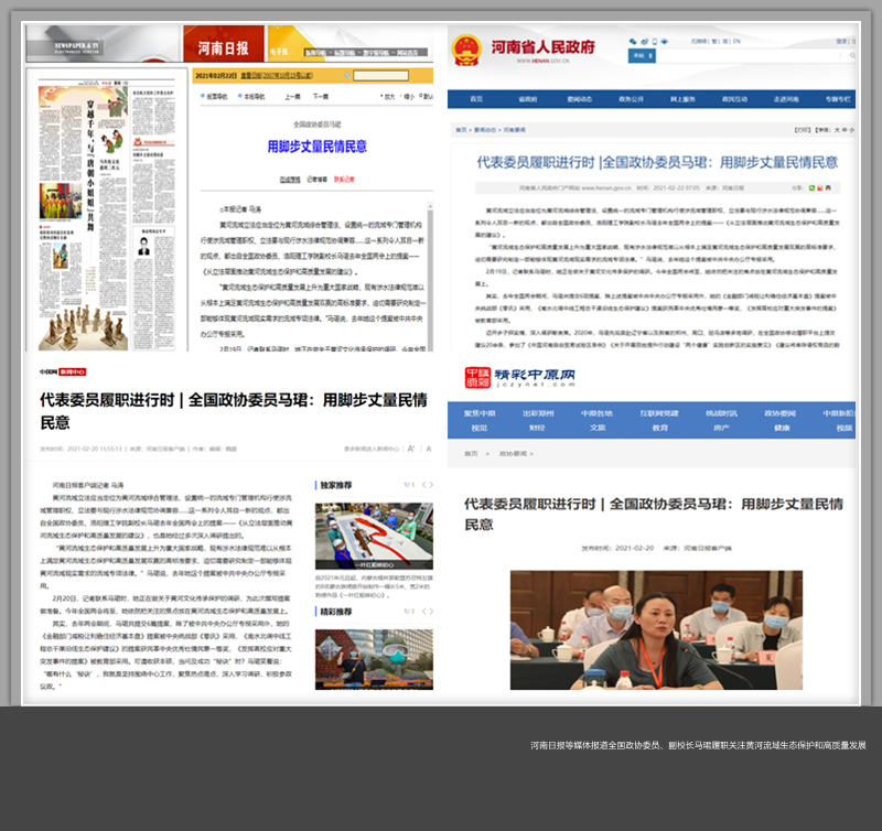 2月22日,河南日报以《全国政协委员马珺:用脚步丈量民情民意》为题报道了马珺关注黄河流域生态保护和高质量发展情况。