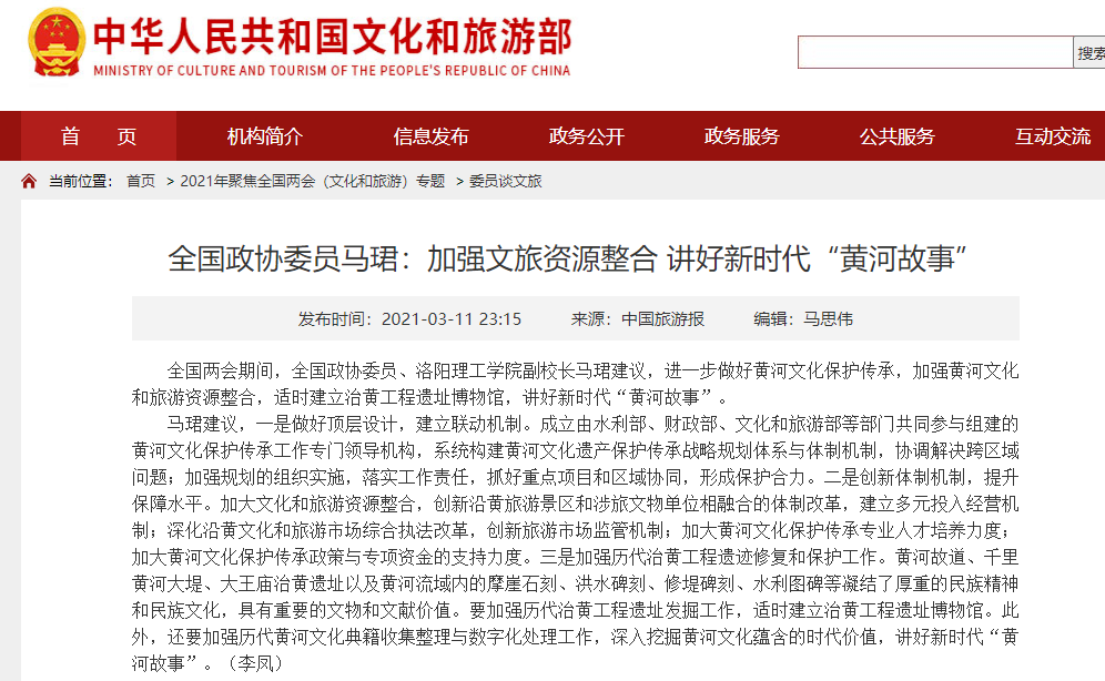 3月11日,中国旅游报以《全国政协委员马珺:文旅融合讲好新时代“黄河故事”》为题刊发专题报道,文化和旅游部官方网站、学习强国等平台予以转载转发。