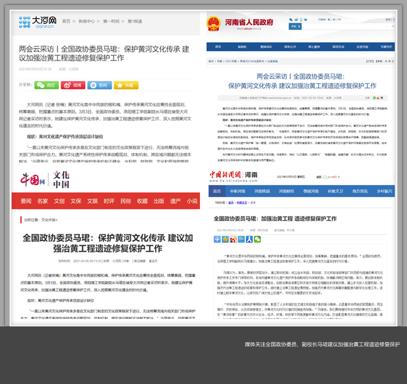 3月3日,大河网以《两会云采访丨全国政协委员马珺:保护黄河文化传承 建议加强治黄工程遗迹修复保护工作》为题刊发报道。中国网、河南省政府网、中新网等媒体予以转载。