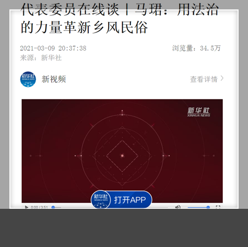 3月9日,新华社客户端发表视频“代表委员在线谈-马珺:用法治的力量革新乡风民俗”。