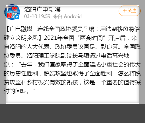 3月10日。洛阳广电融媒发表报道“连线全国政协委员马珺:用法制移风易俗 建立文明乡风”。