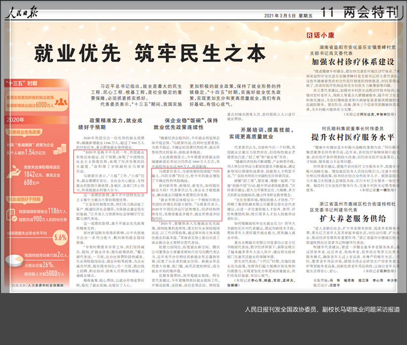 3月5日,人民日报11版“两会特刊”发表《就业优先 筑牢民生之本》专题报道,副校长马珺畅谈就业工作。中国共产党新闻网、中国政府网等各大媒体予以转载报道。