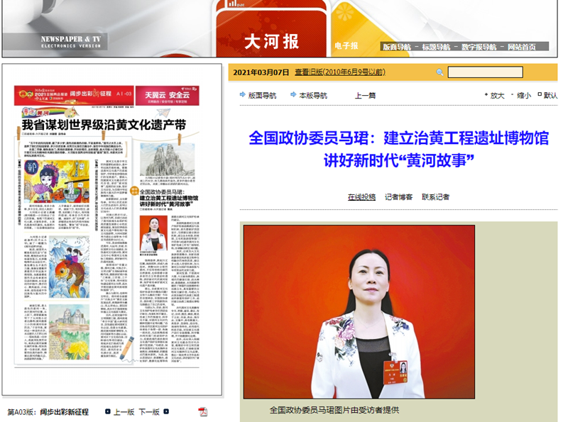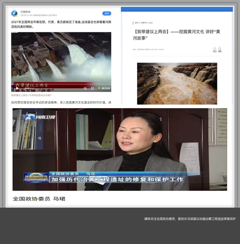 3月1日,大象网以《【我带建议上两会】——挖掘黄河文化 讲好“黄河故事”》为题发布马珺采访报道。3月3日播出的《河南新闻联播》以【开新局 出新彩·我带建议上两会 】我为百姓“代言”为题播出马珺呼吁加强历代治黄工程遗址修复保护工作报道。
