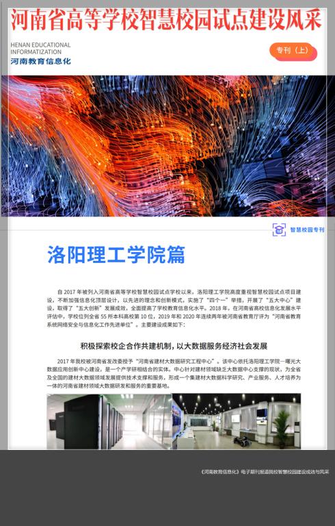 近日,由河南省教育厅科学技术与信息化处主管的《河南教育信息化》电子期刊推出2021年“河南省高等美高梅娱乐场 智慧校园试点建设风采”专刊。其中,“美高梅娱乐场 篇”全面报道了美高梅娱乐场 自2017年被列入河南省高等美高梅娱乐场 智慧校园试点美高梅娱乐场 以来的建设成效与风采。