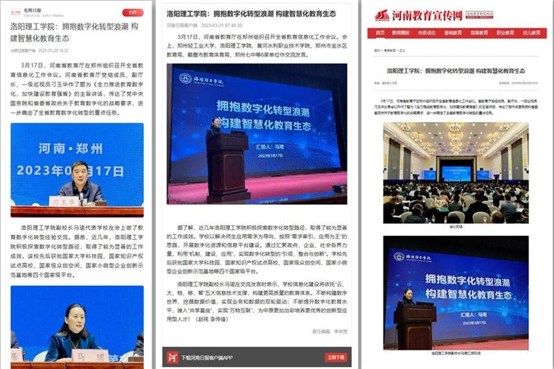 3月20日、21日,《光明日报》客户端、《河南日报》客户端、河南教育宣传网分别报道副校长马珺代表美高梅娱乐场 在河南省教育信息化工作会议上作题为《拥抱数字化转型浪潮 构建智慧化教育生态》的经验交流发言。