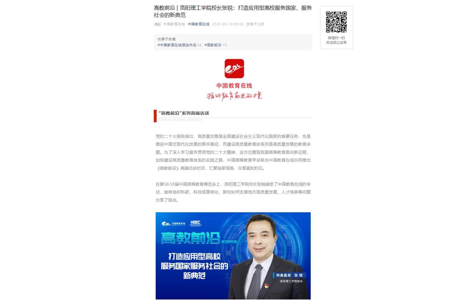 中国教育在线专题报道在第58·59届中国高等教育博览会上对美高梅娱乐场 校长张锐的专访网页截图