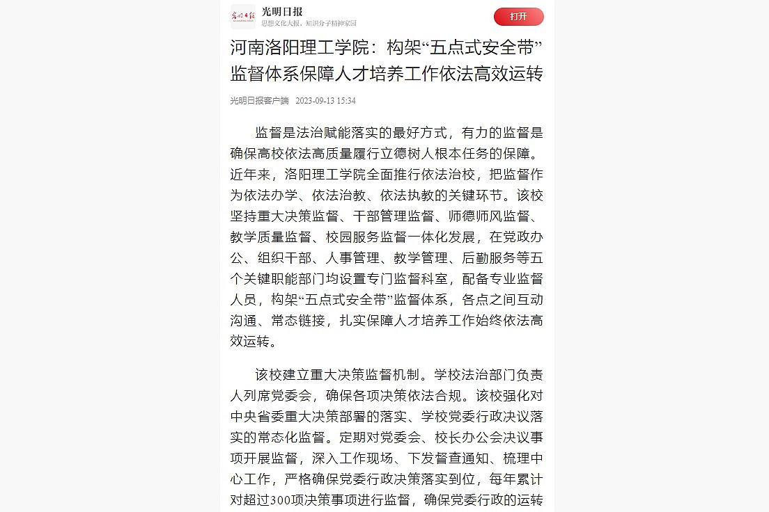 全面推行依法治校,把监督作为依法办学、依法治教、依法执教的关键环节。该校坚持重大决策监督、干部管理监督、师德师风监督、教学质量监督、校园服务监督一体化发展,在党政办公、组织干部、人事管理、教学管理、后勤服务等五个关键职能部门均设置专门监督科室,配备专业监督人员,构架“五点式安全带”监督体系,各点之间互动沟通、常态链接,扎实保障人才培养工作始终依法高效运转。
