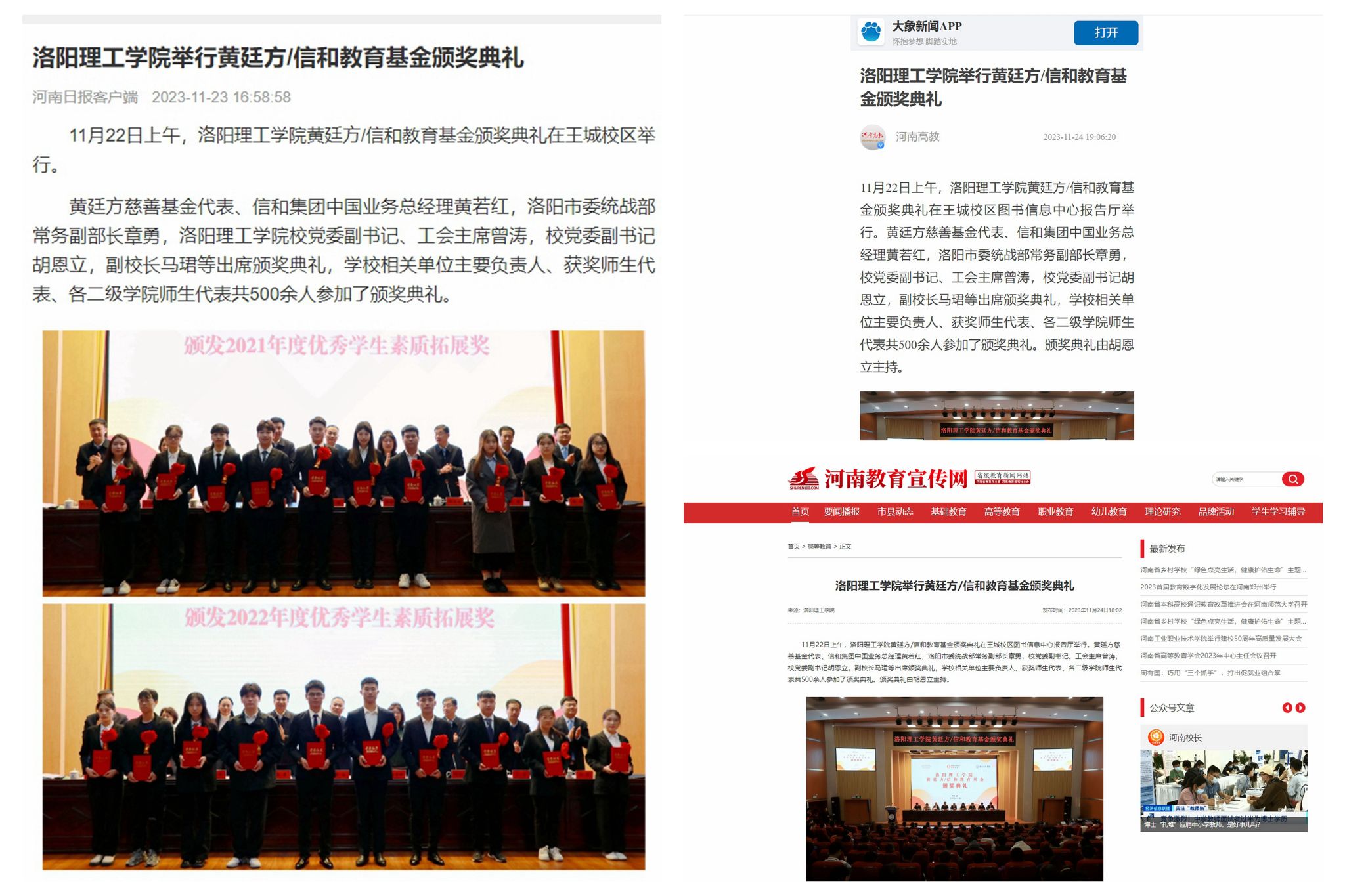 1、《河南日报》客户端,2023年11月23日,《美高梅娱乐场 举行黄廷方/信和教育基金颁奖典礼》,
