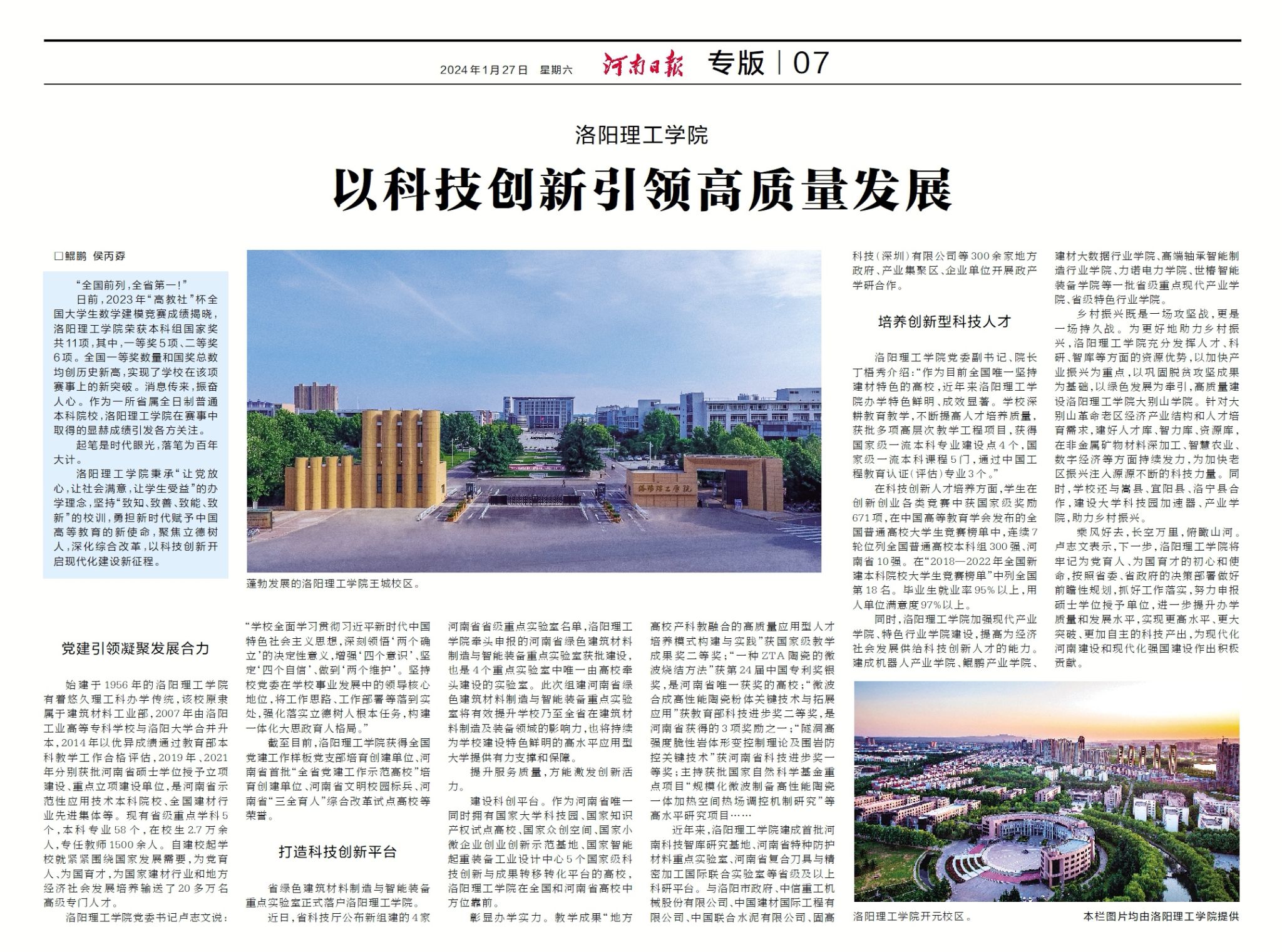 1、《河南日报》1月27日07版,《洛阳理工院 以科技创新引领高质量发展》: