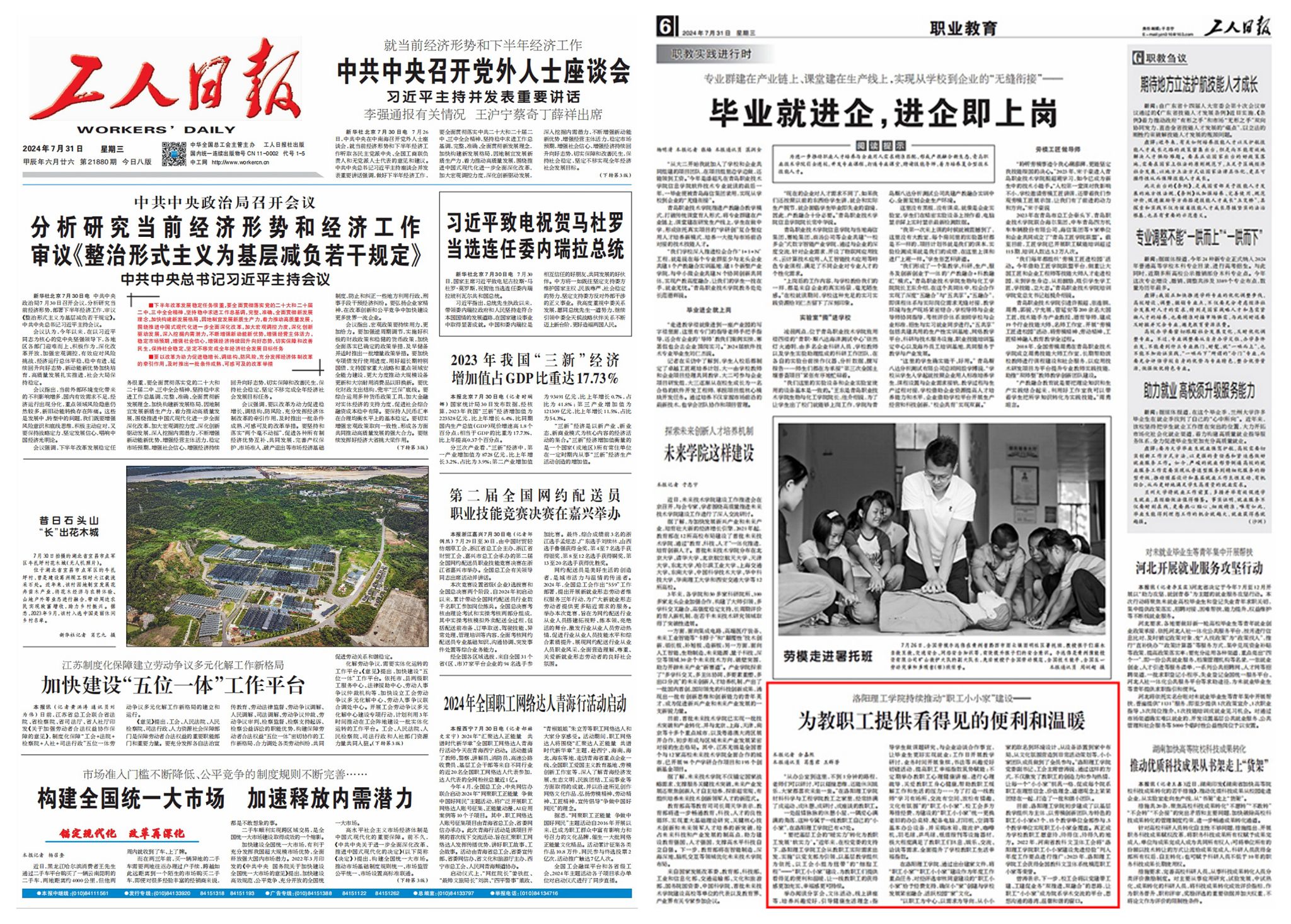2024年7月31日出版的《工人日报》头版和第06版