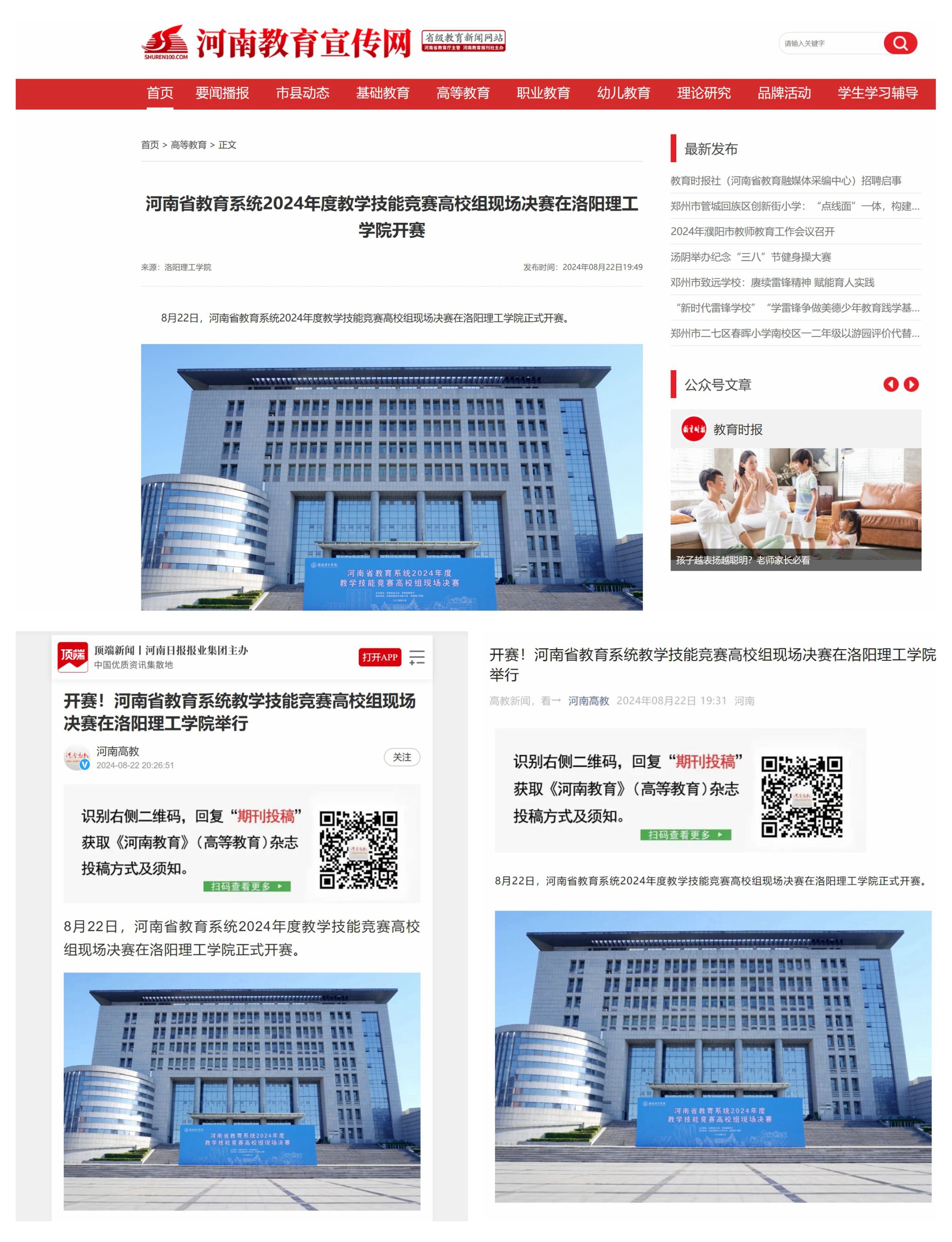 8月22日,河南教育宣传网,《河南高教》顶端号、微信公众号等媒体平台分别报道河南省教育系统2024年度教学技能竞赛高校组现场决赛在美高梅娱乐场