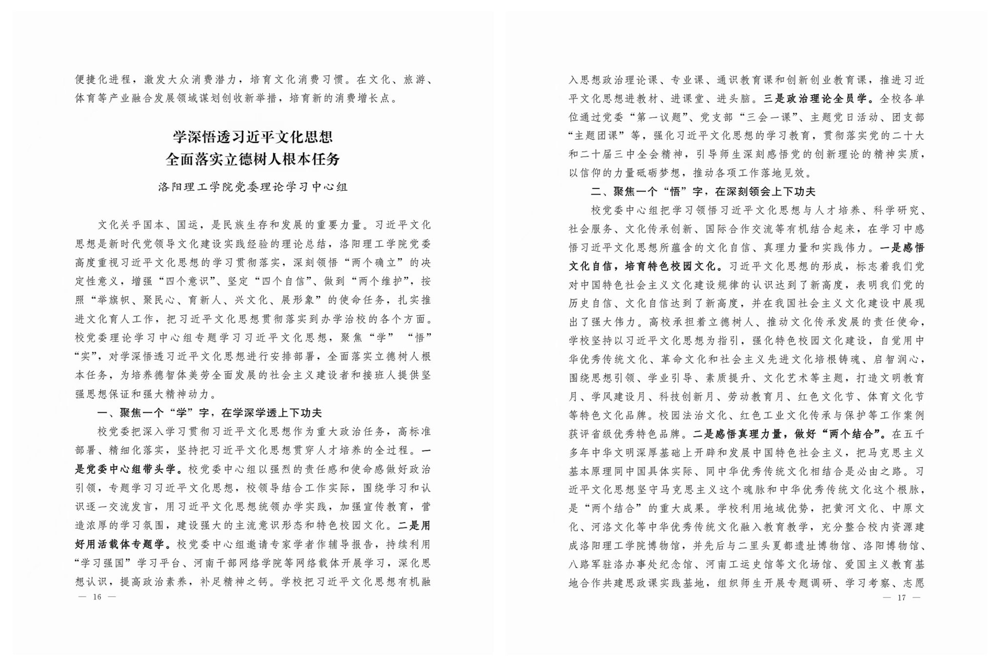 党委高度重视习近平文化思想的学习贯彻落实,深刻领悟“两个确立”的决定性意义,增强“四个意识”、坚定“四个自信”、做到“两个维护”,按照“举旗帜、聚民心、育新人、兴文化、展形象”的使命任务,扎实推进文化育人工作,把习近平文化思想贯彻落实到办学治校的各个方面。校党委理论学习中心组专题学习习近平文化思想,聚焦“学”“悟”“实”,对学深悟透习近平文化思想进行安排部署,全面落实立德树人根本任务,为培养德智体美劳全面发展的社会主义建设者和接班人提供坚强思想保证和强大精神动力。