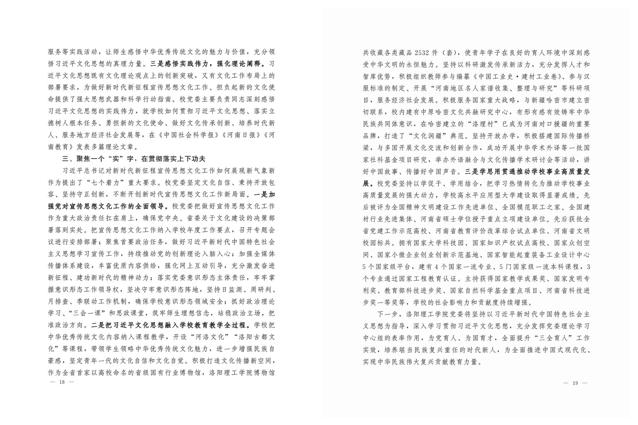 博物馆共收藏各类藏品2532件(套),使青年学子在良好的育人环境中深刻感受中华文明的永恒魅力。坚持以科研激发传承新活力,充分发挥人才和智库优势,积极组织教师参与编纂《中国工业史·建材工业卷》、参与汉服标准的制定、开展“河南地区名人家谱收集、整理与研究”等科研项目,服务经济社会发展。积极服务国家重大战略,与新疆哈密市建立密切联系,校内建有中原哈密文化共融研究中心,有形有感有效铸牢中华民族共同体意识,在哈密建立的“洛理村”已成为河南对口援疆的重要品牌,打造了“文化润疆”典范。坚持开放办学,积极搭建国际传播桥梁,与多国开展文化交流和创新合作,成功开展中华学术外译等一批国家社科基金项目研究,举办外语融合与文化传播学术研讨会等活动,讲好中国故事、传播好中国声音。三是学思用贯通推动美高梅娱乐场