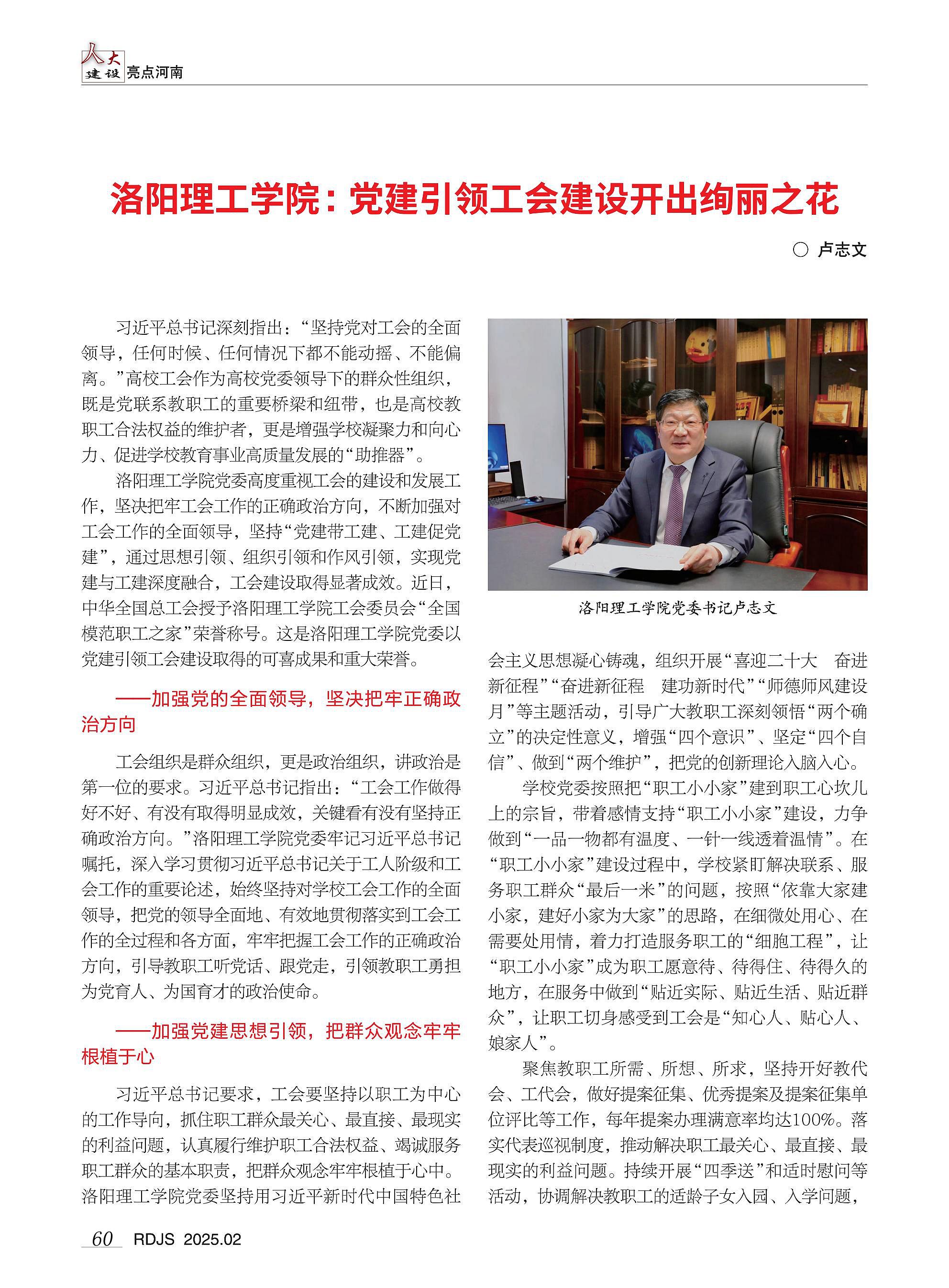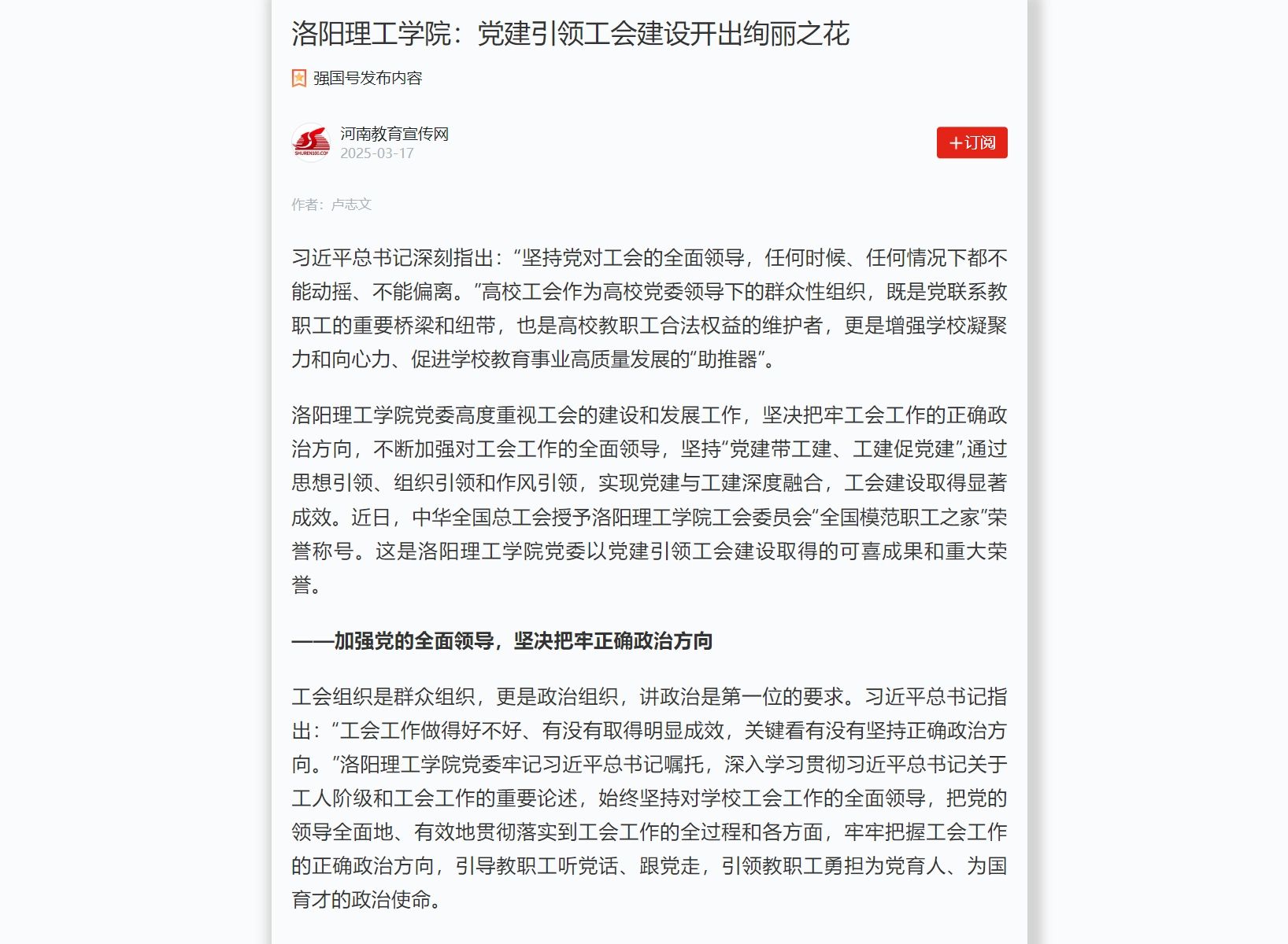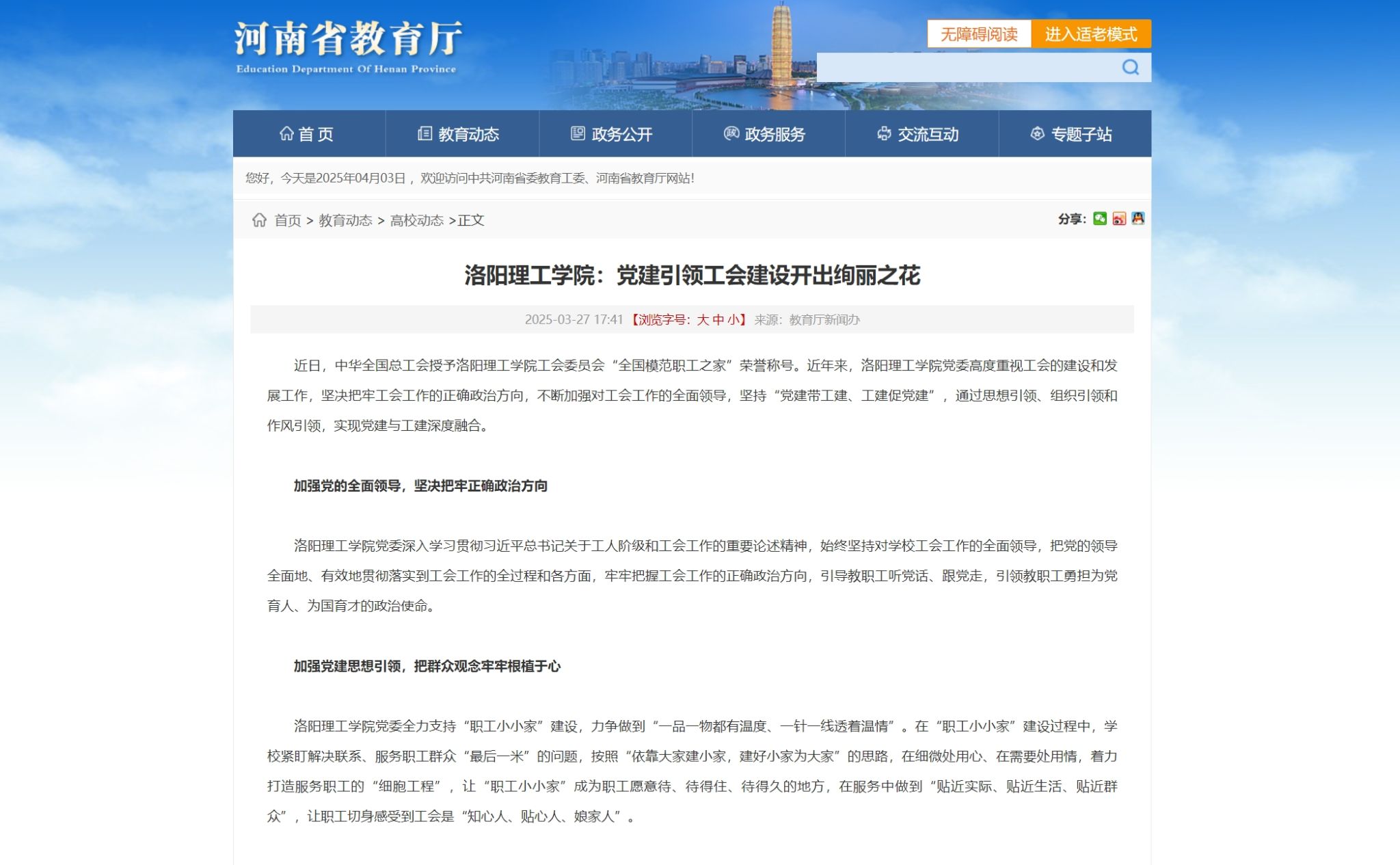 :党建引领工会建设开出绚丽之花》。河南省教育厅网站、学习强国平台也于近日报道该文章。