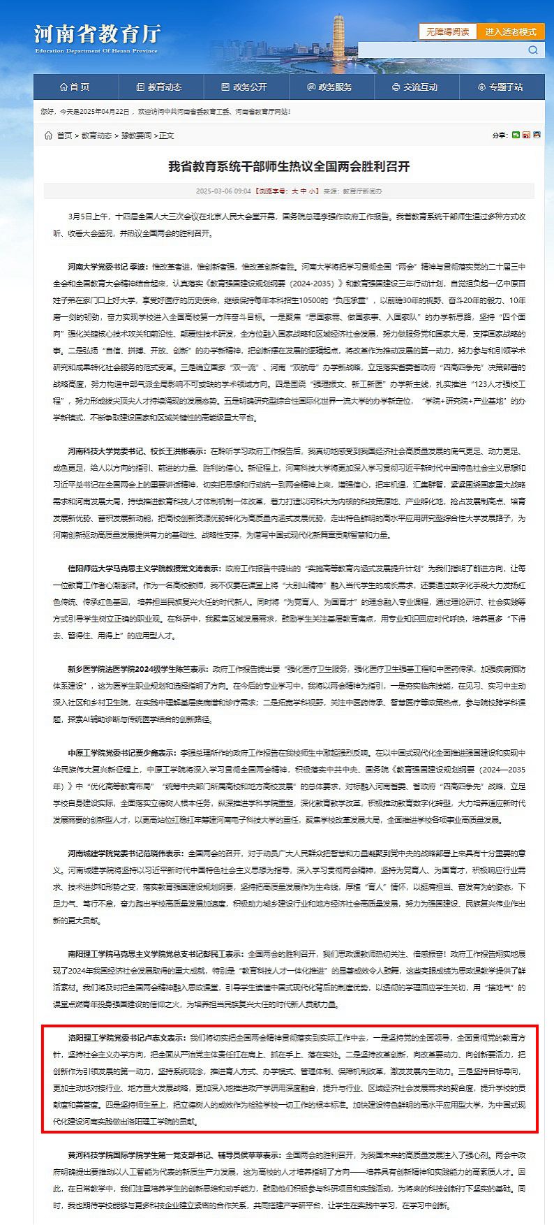 河南省教育厅,2025年3月6日,《我省教育系统干部师生热议全国两会胜利召开》