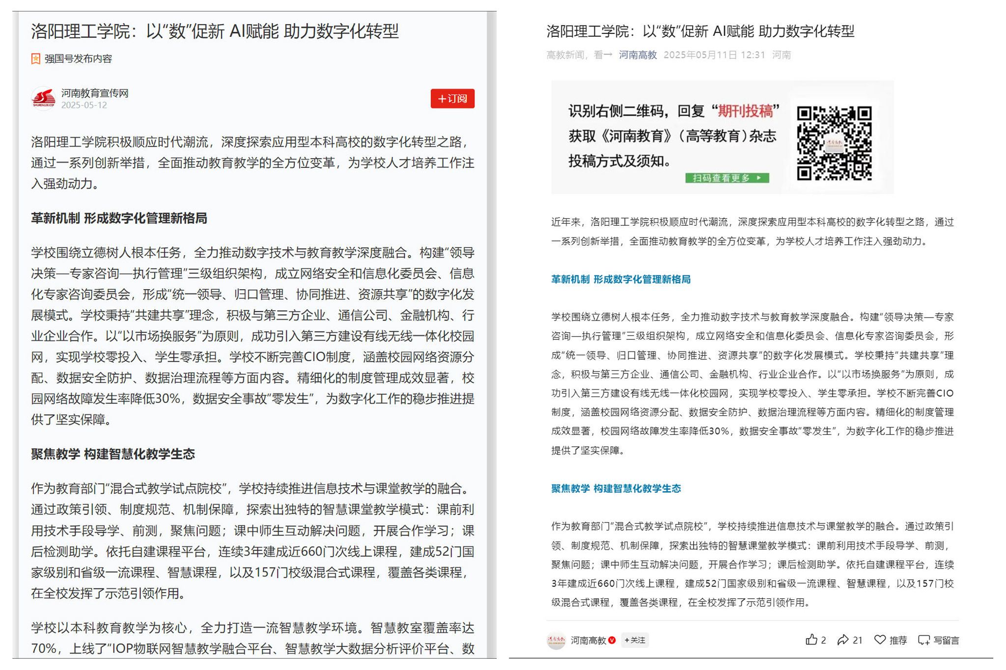 学习强国平台、河南高教公众号报道版面