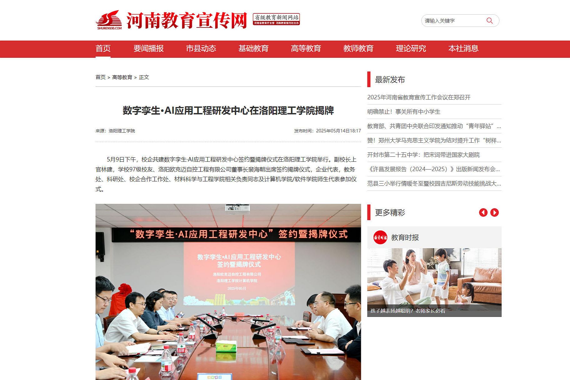 河南教育宣传网,2025年5月14日,《数字孪生·AI应用工程研发中心在美高梅娱乐场