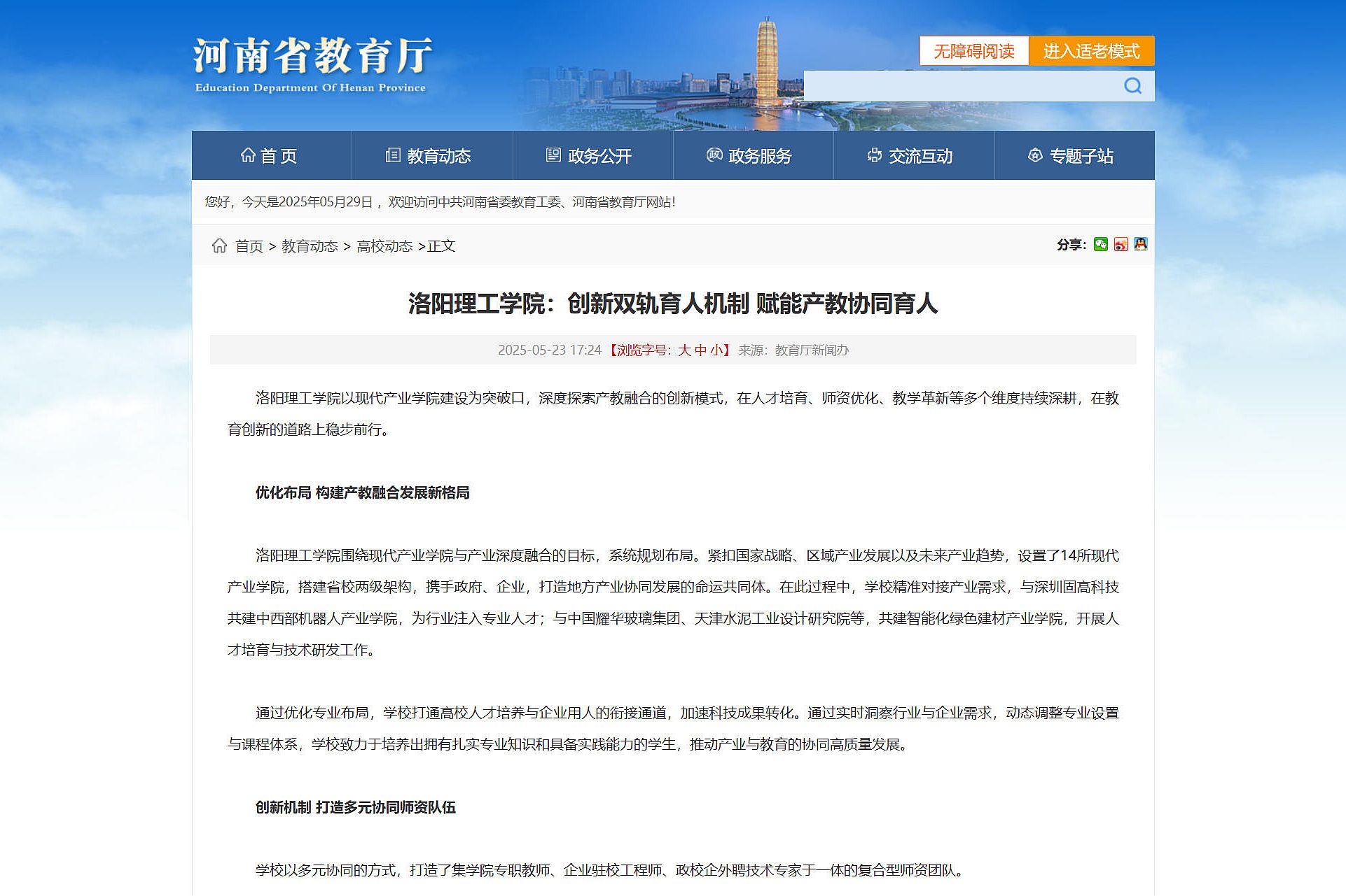 河南省教育厅,2025年5月23日,《美高梅娱乐场 :创新双轨育人机制 赋能产教协同育人》