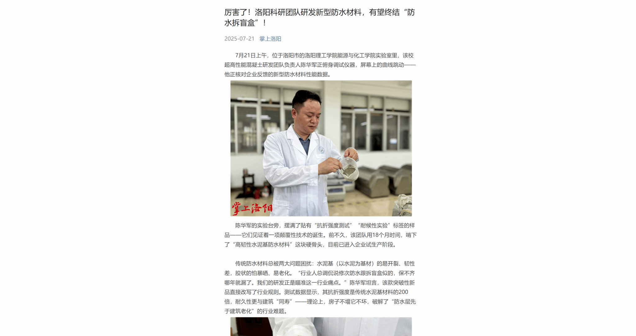 洛阳日报,2025年7月21日,《厉害了!洛阳科研团队研发新型防水材料,有望终结“防水拆盲盒”!》