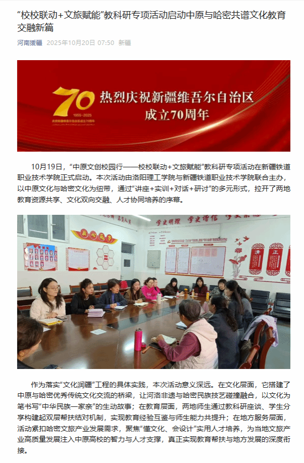 河南援疆公众号,2025年10月20日,《“校校联动+文旅赋能”教科研专项活动启动中原与哈密共谱文化教育交融新篇》
