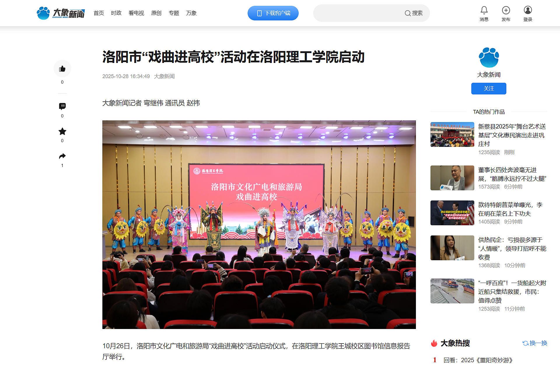 1.大象新闻,2025年10月28日,《洛阳市“戏曲进高校”活动在美高梅娱乐场