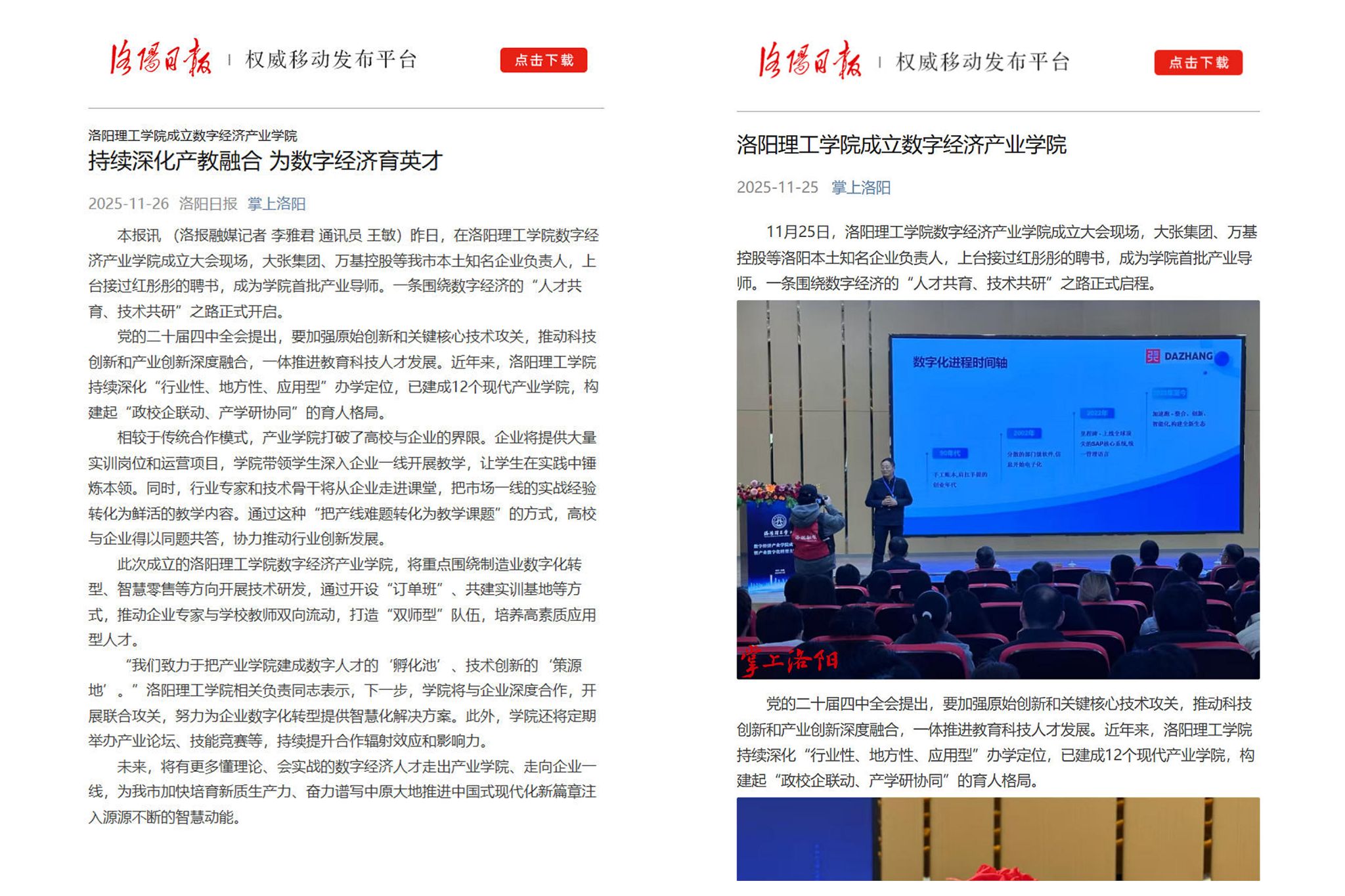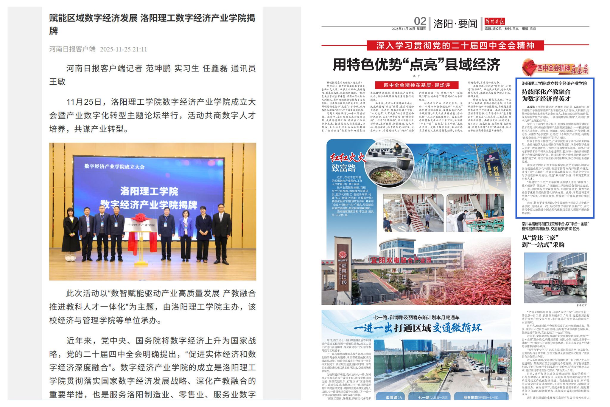 1.河南日报客户端,2025年11月25日,《赋能区域数字经济发展 洛阳理工数字经济产业美高梅娱乐场