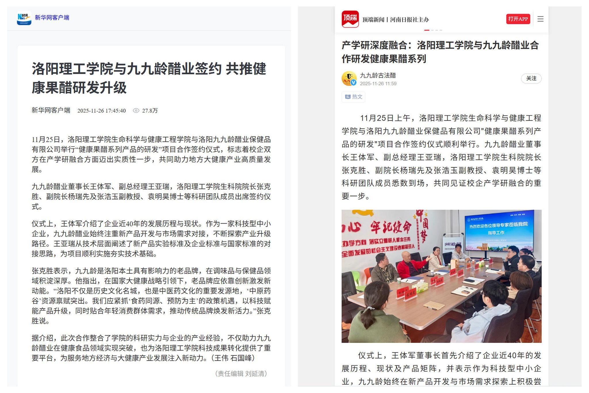 与洛阳九九龄醋业保健品有限公司举行“健康果醋系列产品的研发”项目合作签约仪式。