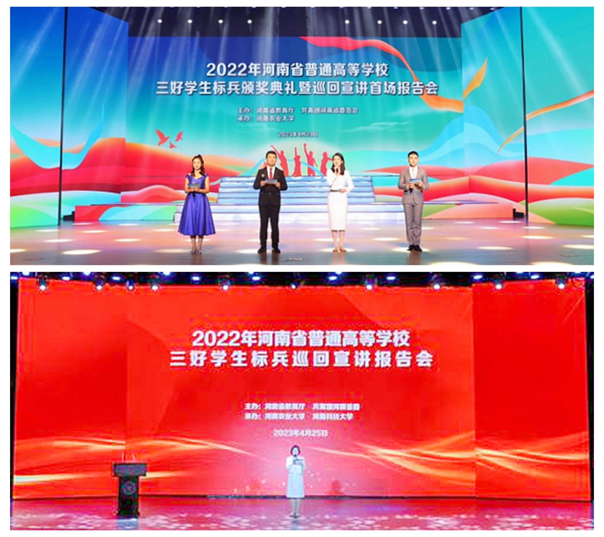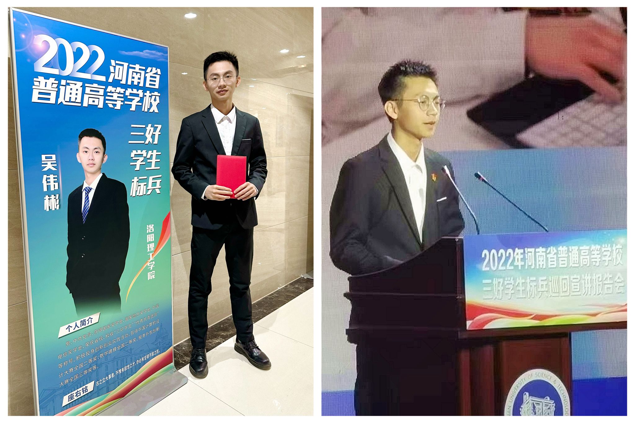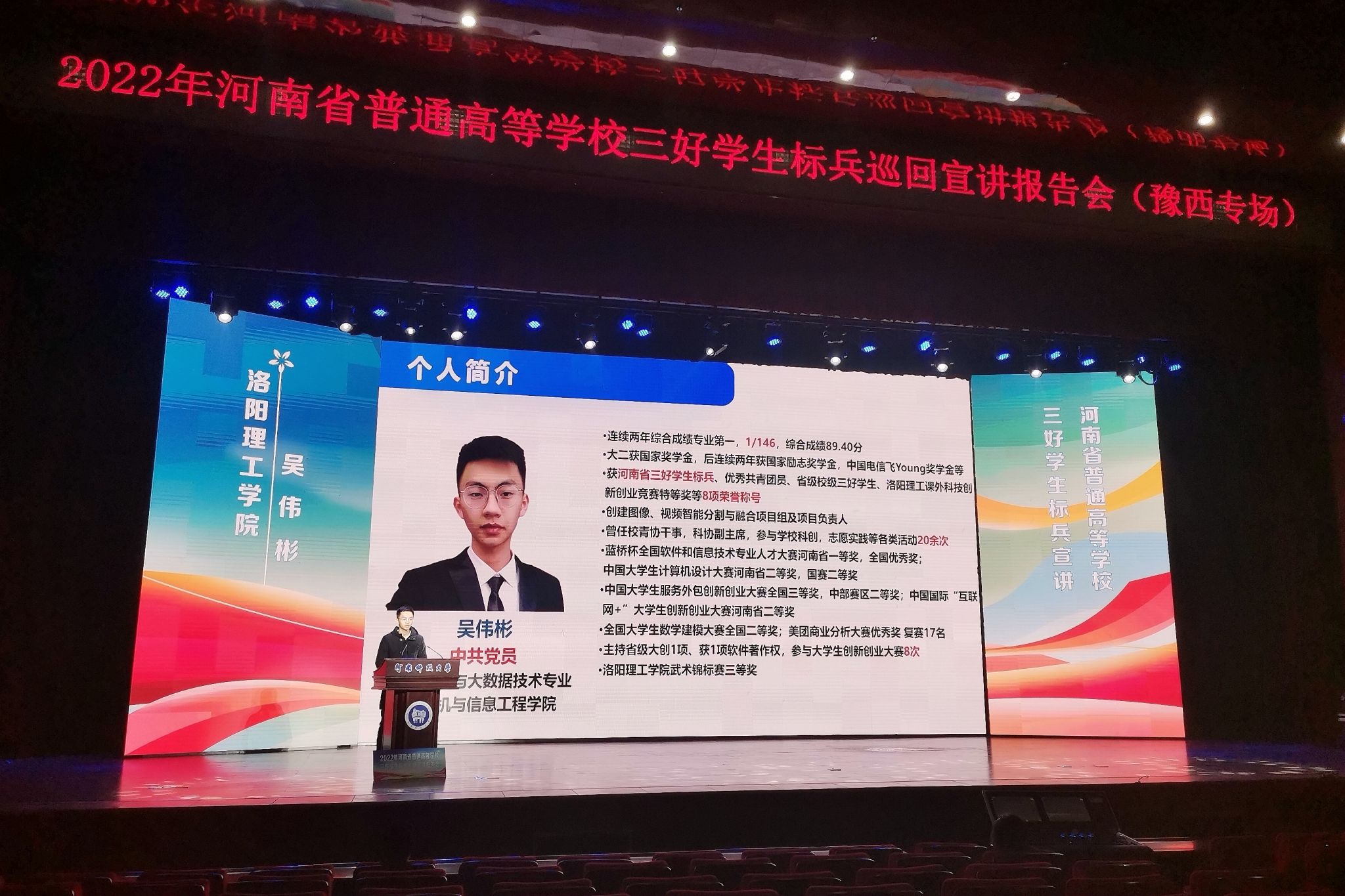 近日,由河南省教育厅、共青团河南省委主办,河南农业大学、河南科技大学承办的“河南省2022年普通高等美高梅娱乐场 三好学生标兵巡回宣讲报告会”分别在河南农业大学、河南科技大学举行。美高梅娱乐场 2019级计算机与信息工程美高梅娱乐场 数据科学与大数据专业学生、河南省三好学生标兵吴伟彬作为宣讲团成员参加了两场巡回宣讲报告会。