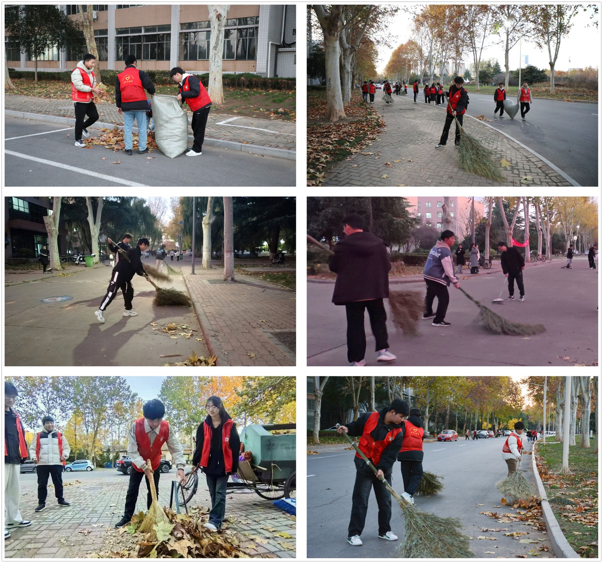 大学生志愿者清扫校园落叶现场