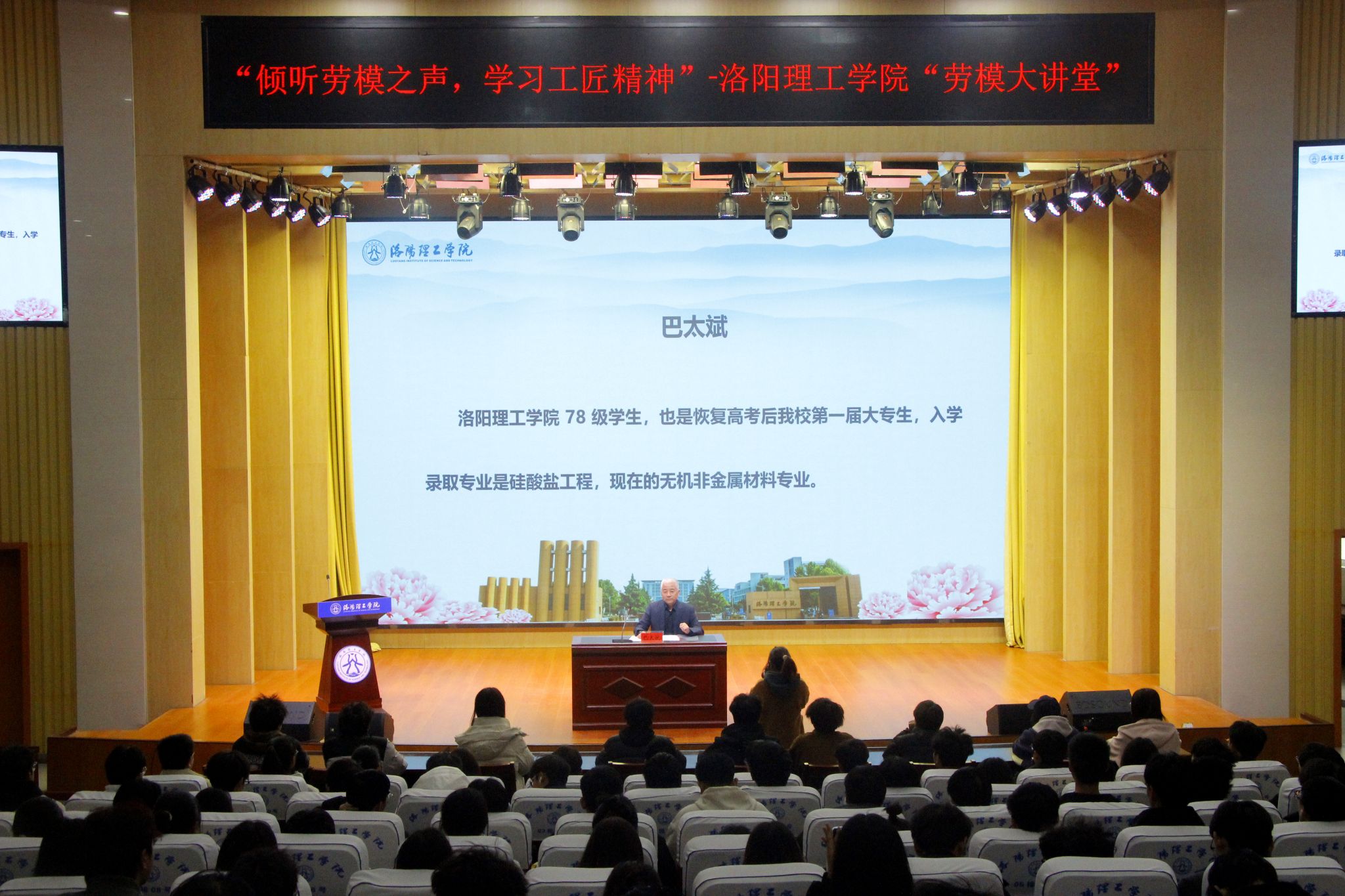 为深入学习贯彻党的二十届三中全会精神,大力弘扬劳模精神、劳动精神、工匠精神,充分发挥先进典型的模范带头作用,12月5日下午,美高梅娱乐场 在王城校区图书信息中心报告厅举办“劳模大讲堂”。活动特邀全国建材行业劳动模范、河南省五一劳动奖章获得者、美高梅娱乐场 78级校友巴太斌为师生们带来了一场精彩的专题报告。学生工作处、社会合作与校友办公室、相关二级美高梅娱乐场 负责人及2024级学生代表参加报告会。