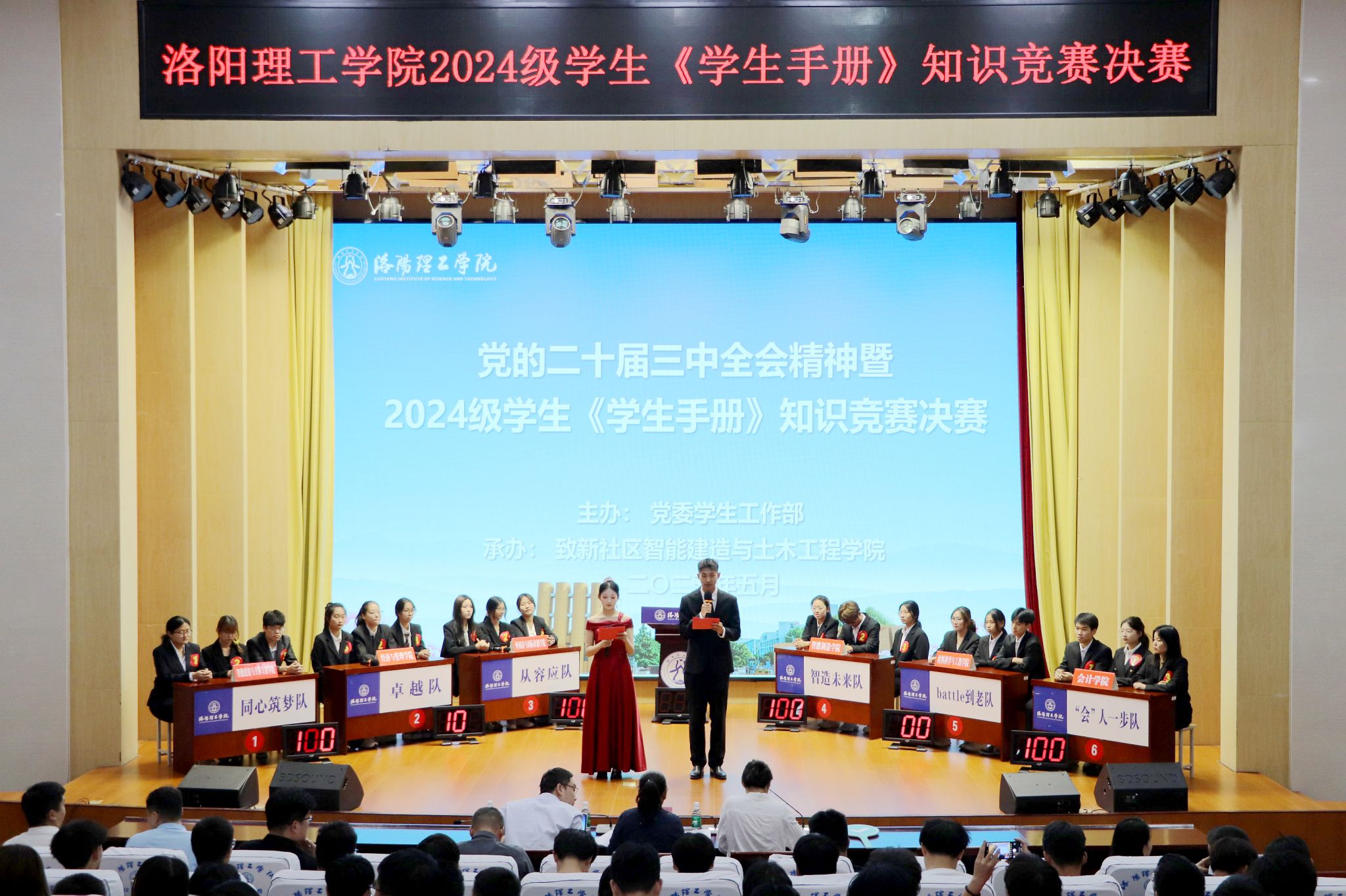 5月29日下午,美高梅娱乐场 党的二十届三中全会精神暨2024级学生《学生手册》知识竞赛决赛在王城校区图书信息中心报告厅举办。学生工作处、一站式学生社区等相关部门负责同志,部分二级美高梅娱乐场 党委副书记、学工办主任、辅导员及学生代表共400余人参加活动。比赛由学生工作处主办、智能建造与土木工程美高梅娱乐场 承办。