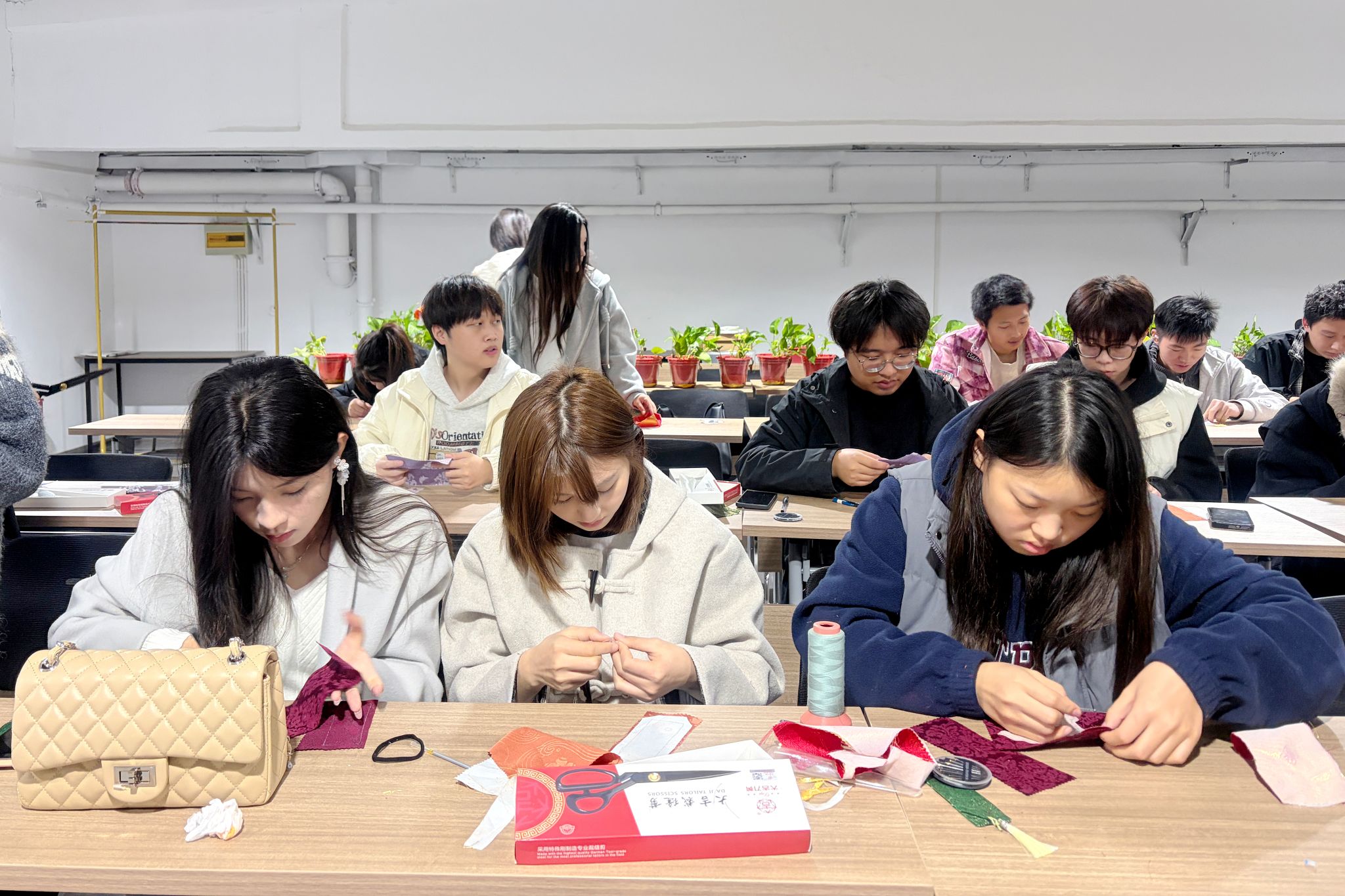 动手实践环节,在设计导师的带领下,同学们以汉服元素为灵感,亲手制作了书签、挂饰等文创小物,将理论认知转化为可触摸的美学产物。现场气氛热烈,同学们纷纷表示,这种融合视听与实操的教学方式,让书本中的汉服知识“活”了起来。