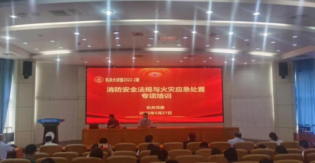 消防安全委员会《2022年火灾警示宣传教育月活动方案》部署,5月27日下午,机关党委在王城校区二楼报告厅举办机关大讲堂2022年第二期,邀请洛阳市消防学会秘书长户金全对机关各部门消防安全管理人及科级干部开展消防安全法规与火灾应急处置专项培训。保卫处副处长马东利主持会议。