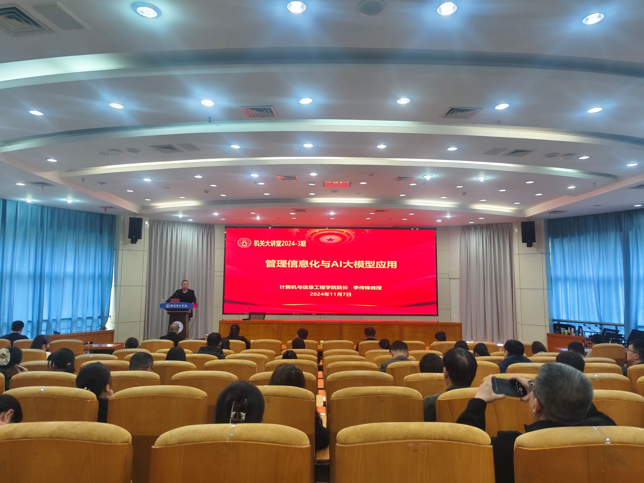 院长李传锋教授开展题为《管理信息化与AI大模型应用》专题培训。机关党委书记孟庆湖主持大讲堂,机关科级及以下教职工参加。