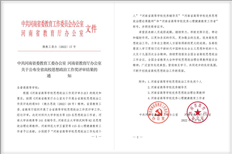 近日,省委教育工委办公室、省教育厅办公室下发《中共河南省委教育工委办公室 河南省教育厅办公室关于公布全省高校思想政治工作奖评审结果的通知》(豫教工委办〔2022〕17号),揭晓2022年度“河南省高等美高梅娱乐场
