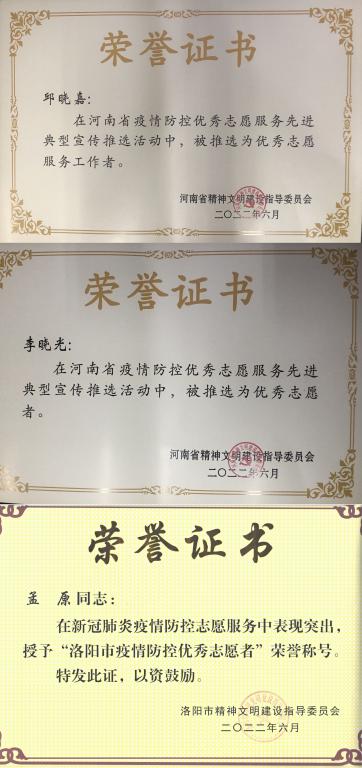 新冠疫情以来,机关广大干部职工积极践行“奉献、有爱、互助、进步”的志愿者精神,主动参加美高梅娱乐场 疫情防控志愿服务,为疫情防控工作做出了积极贡献,充分彰显了志愿大爱和责任担当的精神,机关多名同志受到上级表彰:邱晓嘉荣获“河南省疫情防控优秀志愿服务工作者”荣誉称号,李晓光荣获“河南省疫情防控优秀志愿者”荣誉称号,孟原荣获“洛阳市疫情防控优秀志愿者”荣誉称号。
