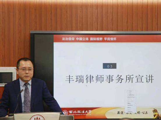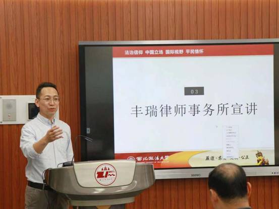 刘仁琦副院长进行第二阶段的主持,他将会议引入丰瑞律师事务所宣讲阶段。张冰律师上台致辞,张律师抒发了自己在多年刑事辩护事务工作中的心得体会,强调了法治事业发展中培养学生的重要性,以及在该方面努力的决心。 其后,陕西丰瑞律师事务所对自身发展前景与近年来的工作做了详细的介绍。陕西丰瑞律师事务所是陕西省乃至全国范围内名列前茅的律所之一,在业界久负盛名,影响力巨大。丰瑞律师事务所不仅长于专业实务,不断学习进取,且对于公益事业怀有极高热情,多年来承接和办理了许多起法律援助案件,为服务社会献出了一腔热忱,更是为全面推进依法治国、建设社会主义法治事业做出了不可磨灭的贡献。