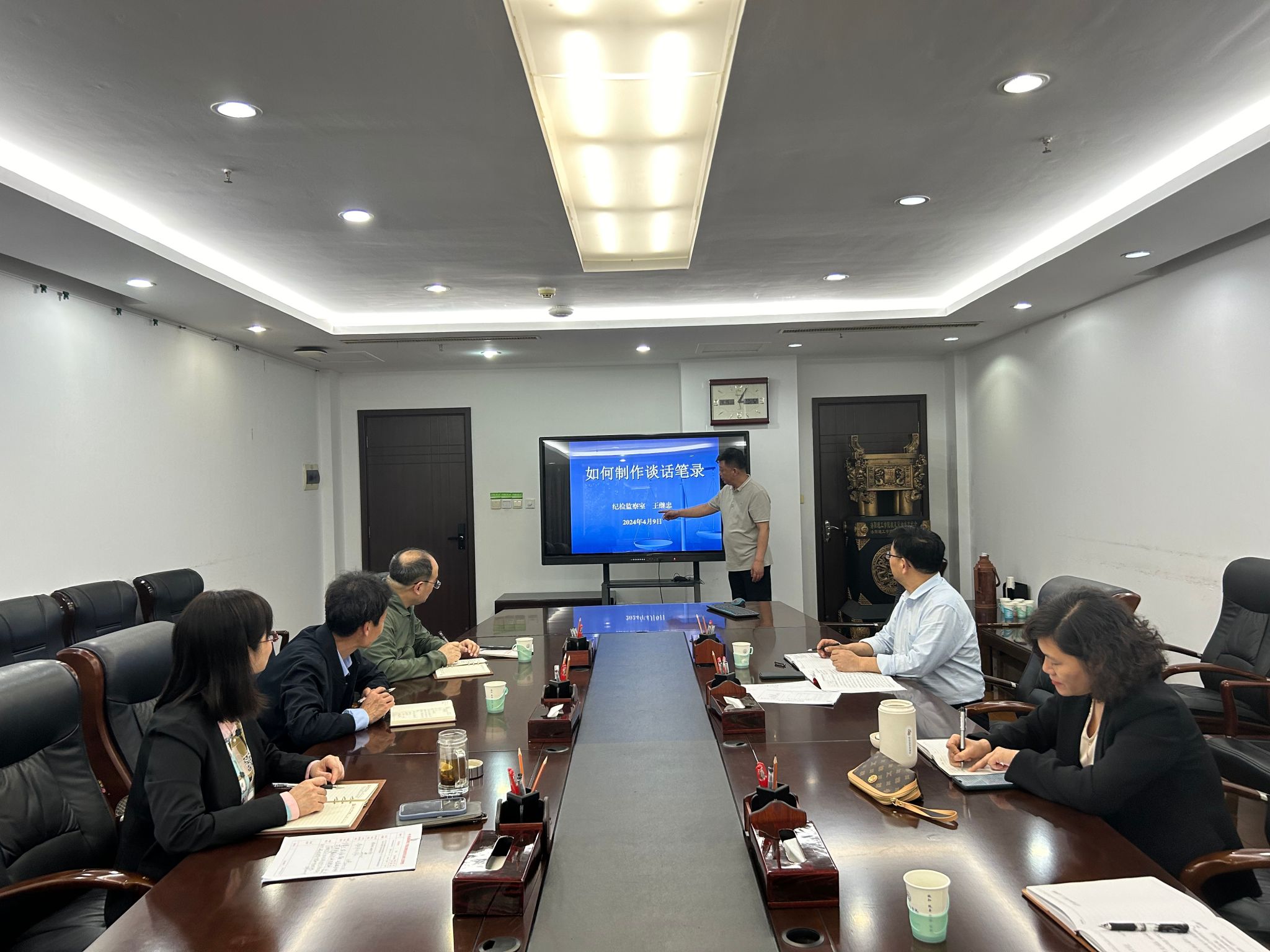 纪检监察工作开展遵循的原则之一是依规依纪依法履行职责,制作一份符合纪法程序要求的谈话笔录是纪检监察干部办案理念、专业技能和文字功底的综合体现。纪检监察室副主任王继忠以《如何制作谈话笔录》为题讲授专题党课,授课内容主要围绕谈话笔录的概念类型、要素特点、注意事项、制作技巧等方面进行了详细讲解。