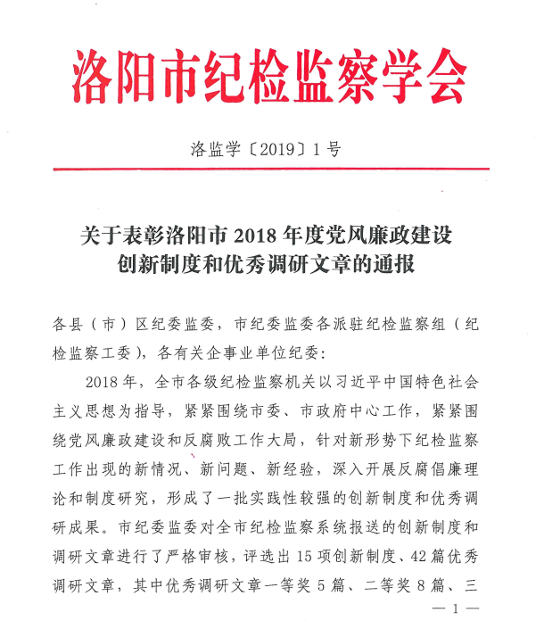 在洛阳市纪检监察学会举办的党风廉政建设创新制度评选活动中,美高梅娱乐场 推荐的制度《切实加强“三重”“三关”监督构建“三不”一体推进工作格局的实施意见》被评为“洛阳市2018年度党风廉政建设创新制度”。