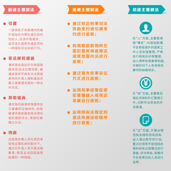 在“钱”方面,主要是加强反洗钱和外汇管理工作,切断非法资金的外流渠道。为此,人民银行、公安部、最高人民法院、最高人民检察院和国家外汇管理局等五部门,联合开展了打击利用离岸公司和地下钱庄向境外转移赃款专项行动。