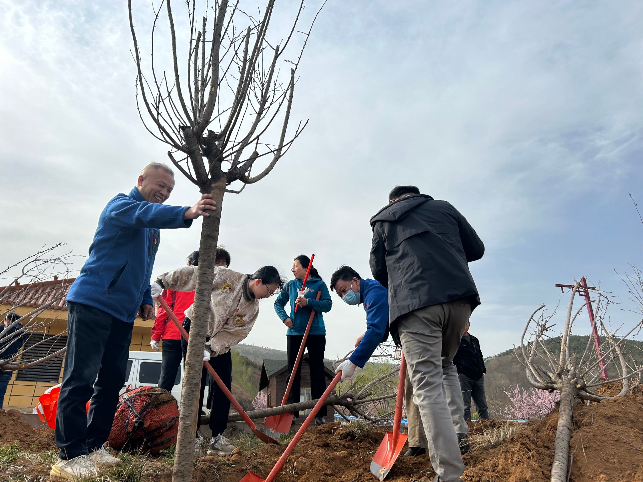 “这棵树再向右边移一点,我来扶一下。”“这地方陡峭,注意安全。”在植树活动现场,大家三两成组,分工协作、干劲十足,有齐心协力地共克难题,也有细致入微的关心提醒,大家认真按照植树的每一步工序,挥锹铲土、扶苗培土、回填压实,在陡峭的山坡边栽种下棵棵樱花树苗,增添了勃勃生机。