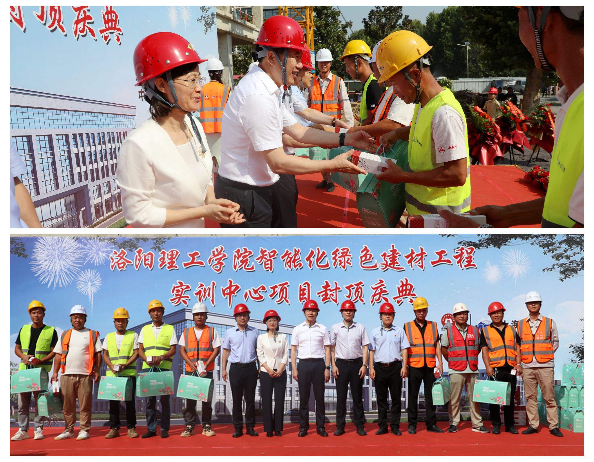 仪式现场,校领导与施工单位、监理单位负责人一同为大楼封顶浇筑混凝土,并向施工人员代表发放慰问品,向他们的辛勤付出和卓越表现表达诚挚的问候和感谢。