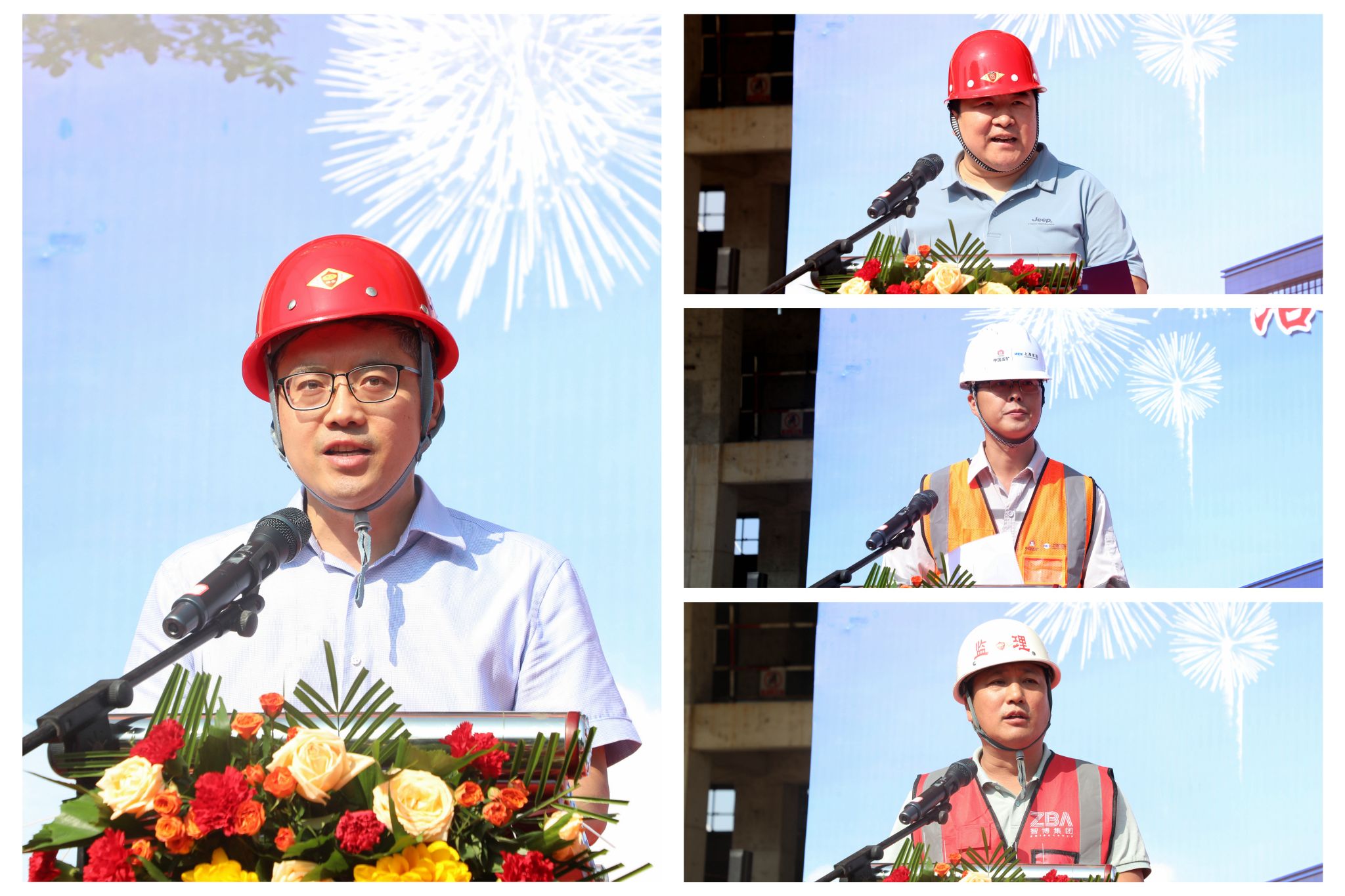 副校长王新武(左)致辞,项目建设管理部门负责人(右上)主持仪式,建设单位代表(右中)和监理单位代表(右下)作表态发言