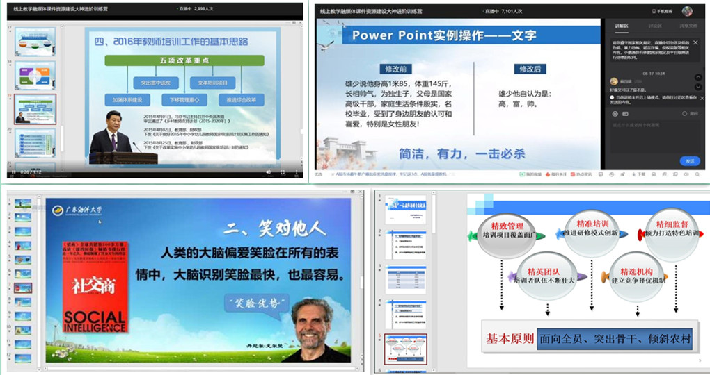 8月17日,美高梅娱乐场 教师发展中心协调高教国培教育科技研究院为老师们申请免费兑换码,组织观看华南师范大学赖国雄的在线直播课程《线上教学融媒体课件资源建设大神进阶训练营》。美高梅娱乐场 50余名教师积极参加此次培训,学习了基于现代信息技术支撑的课件设计、美化技巧等内容,观看过程中,老师们讨论热烈,情绪高涨,纷纷表示收获颇丰,希望以后美高梅娱乐场 能够给大家提供更多这样的观看学习机会。