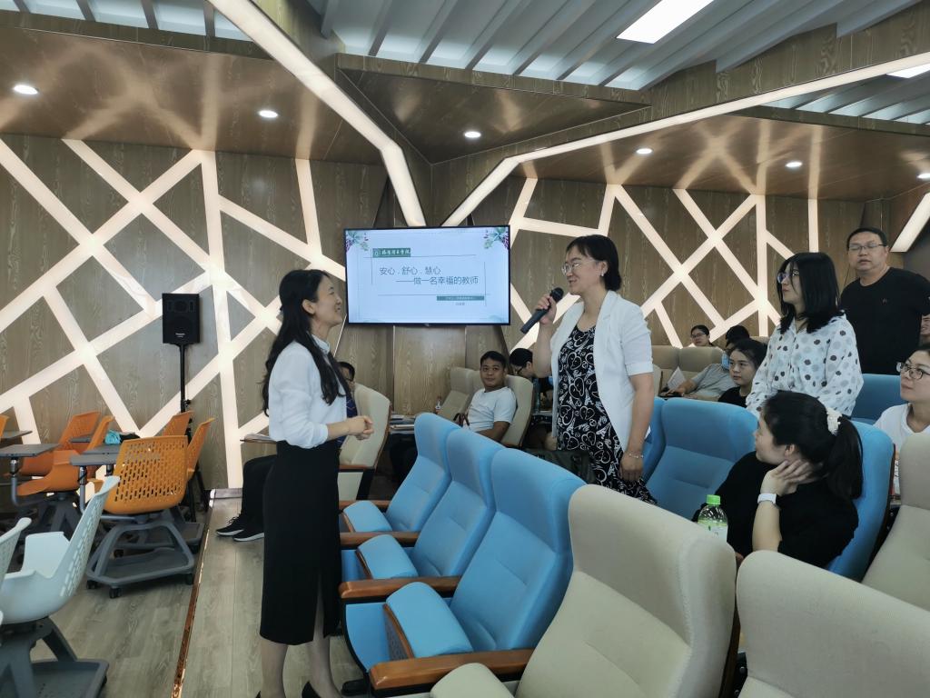 首先,白老师通过妙趣横生的“大风吹”和“投射测验”等心理游戏,与参会老师积极互动,引导大家感受和关注自己的身心状态。接着,为大家介绍生活中的心理学以及心理咨询方面的相关知识,进而深入剖析了情绪的产生与发展机制,教会大家合理疏导情绪与缓解压力的方法,引导新入职教师尝试在悦纳自我与感恩生命的过程中培养乐观平和的心态,提升职业幸福感,把握人生智慧。最后,白老师为大家介绍了大学生常见的心理问题以及存在潜在风险学生的识别与防范,希望老师们在今后的教学工作中用一双慧眼和一颗爱心做好这份育人育心的教师工作,助力学生的成长成才!