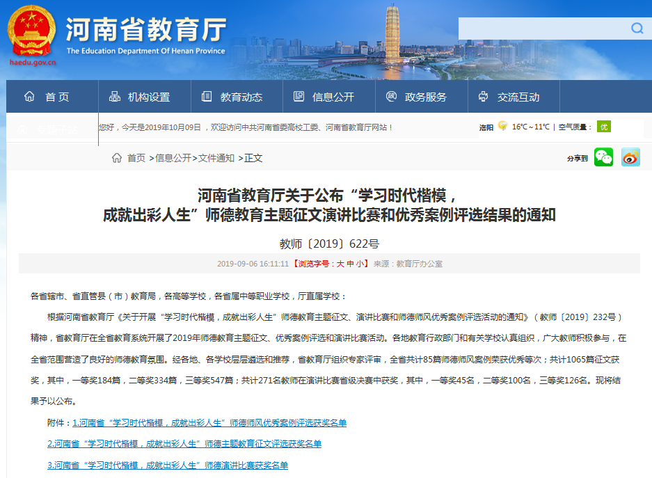 近日,河南省教育厅印发了《关于公布“学习时代楷模,成就出彩人生”师德教育主题征文、演讲比赛和优秀案例评选结果的通知》(教师〔2019〕622号),美高梅娱乐场