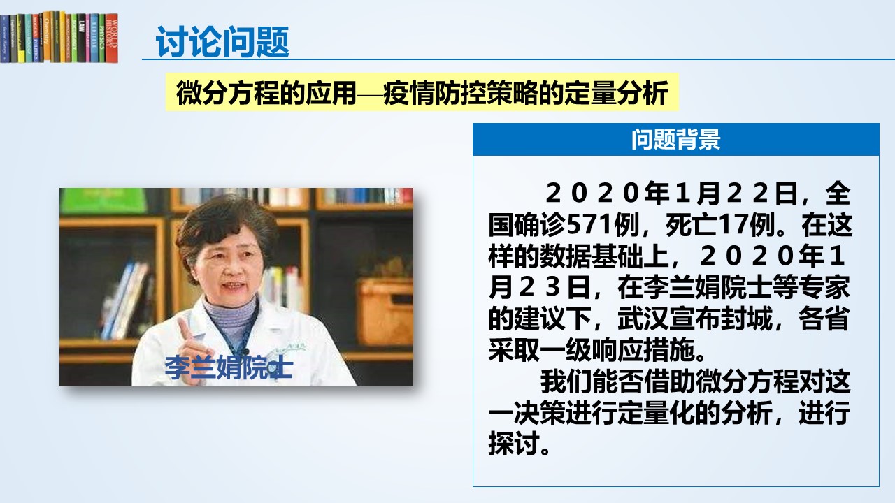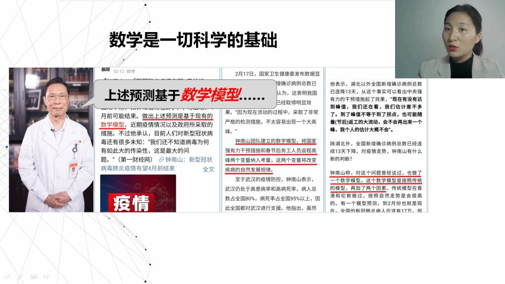 同时,在课程思政的实施部分,除了利用数学史和数学家等传统思政素材进行挖掘和融入外,也注重把疫情当教材。比如:在课程导言中,团队成员给学生重点介绍了钟南山院士及其科研团队的工作,介绍了在抗疫战斗中,每一名医护人员在平凡的岗位上默默付出,汇聚起来形成了巨大的力量,简单的说这就是数学中“积分”的原理。