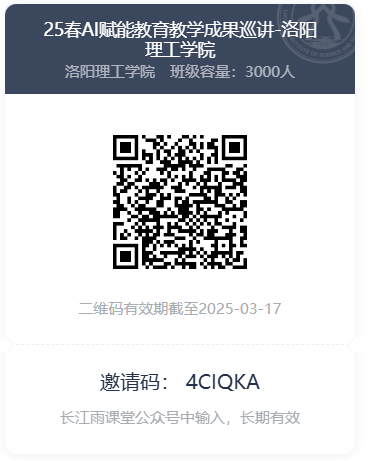 温馨提示:班级二维码有效期至2025年3月17日。班级邀请码无时间限制,在“长江雨课堂”公众号 中,输入班级邀请码即可加入。