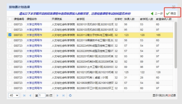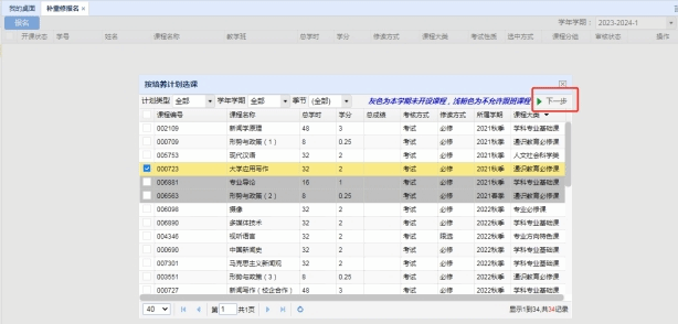 (2)点击“报名服务-补重修报名-报名”按钮,选择需要重修的课程,点击“下一步”,选择需要上课的班级,点击“确定”。